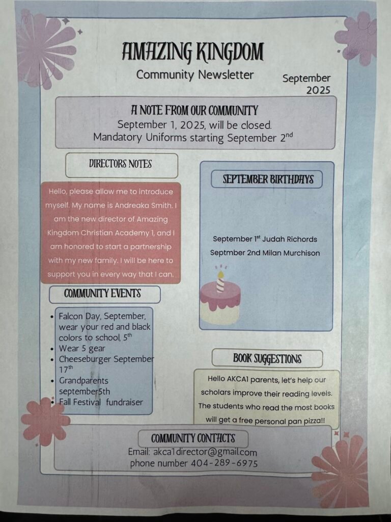 Come experience the warmth, joy, and spirit-led care that define Amazing Kingdom Christian Academy. Our doors are open to families who seek a safe, faith-focused, and nurturing environment where children are encouraged to grow in God’s love while building the foundation for a bright future.